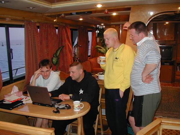 Voll ausgerüstet mit Hi-Tech: Laptop mit DVD-Spieler für die Abende, Tauchcomputer und Interface...