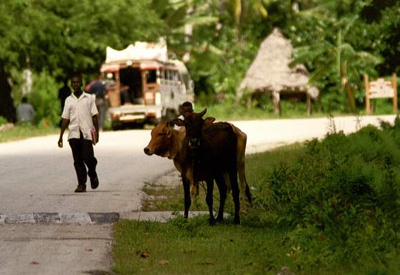 Zurück zur Straße mit dem klassischen Straßenleben: Daladala (Minibus), Kühe und Leute